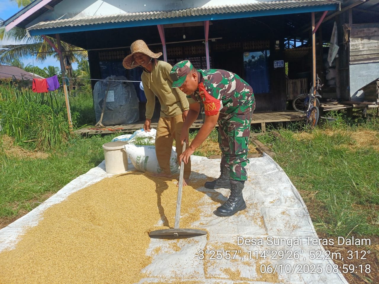 Barito Kuala, Kalimantan Selatan — Dalam rangka mendukung program ketahanan pangan nasional, Babinsa Koramil 1005-11/Tabunganen, Pelda M. Fadli, melaksanakan kegiatan pendampingan hanpangan dengan membantu salah satu petani menjemur padi pasca panen. Kegiatan ini berlangsung di Desa Sungai Teras Dalam, Kecamatan Tabunganen, Kabupaten Barito Kuala. Pada Senin (06/10/2025).