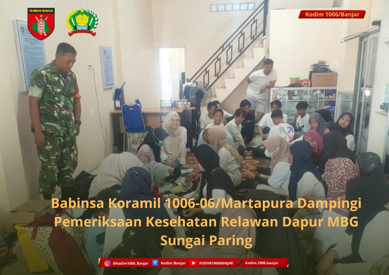 Banjar – Babinsa Kelurahan Sungai Paring, Koramil 1006-06/Martapura Serda Joko Ertanto, melaksanakan pendampingan kegiatan pemeriksaan dan pengecekan kesehatan relawan Dapur Makan Bergizi Gratis (MBG) yang bertempat di Dapur MBG SPPG Sungai Paring 2, Sabtu (31/1/2026).