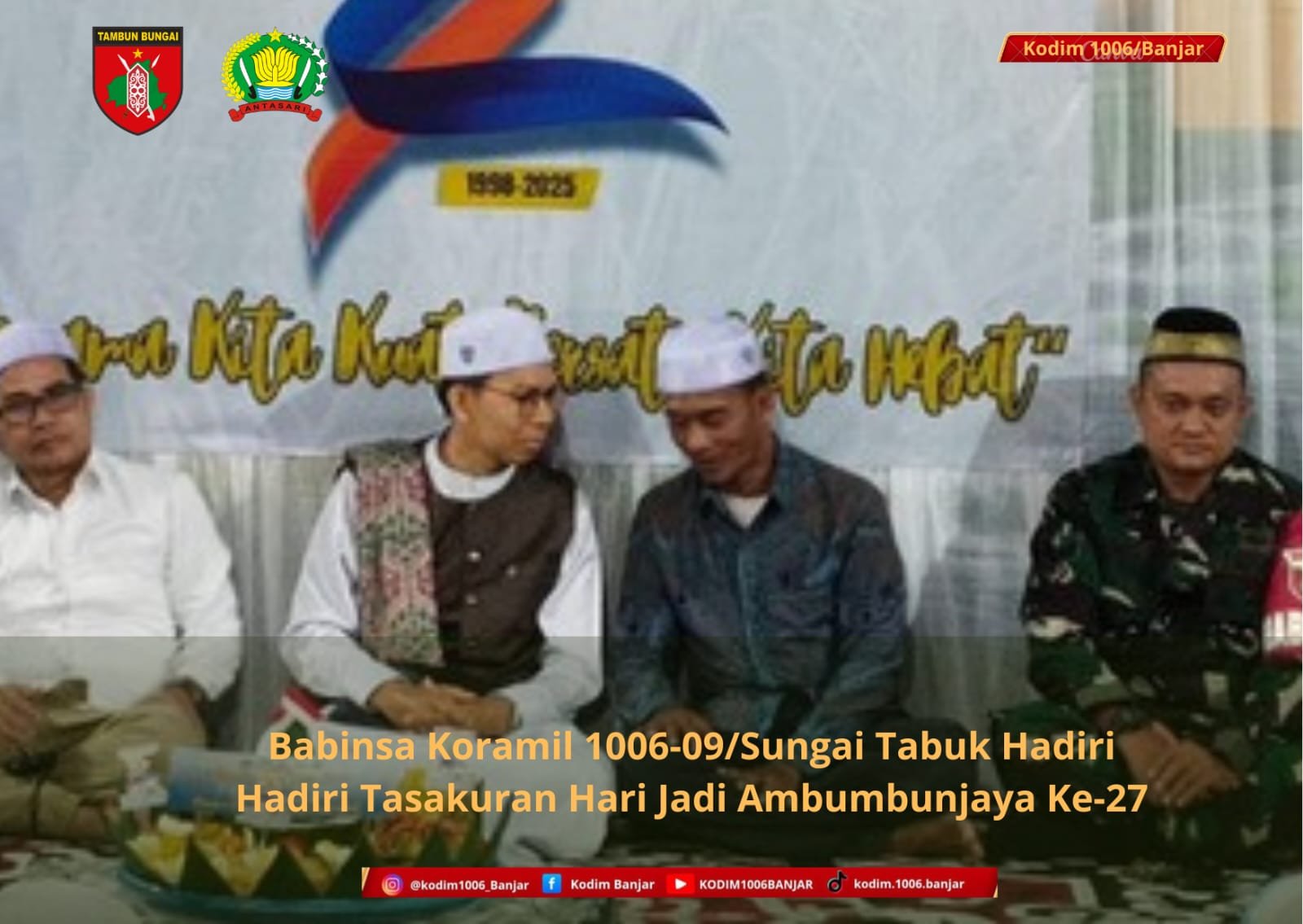 BANJAR – Babinsa Koramil 1006-09/Sungai Tabuk, Sertu Agung Setiawan, menghadiri kegiatan malam tasyakuran dalam rangka Hari Jadi Desa Abumbunjaya ke-27 yang digelar pada Selasa malam, 14 Oktober 2025, bertempat di Desa Abumbunjaya, Kecamatan Sungai Tabuk, Kabupaten Banjar.