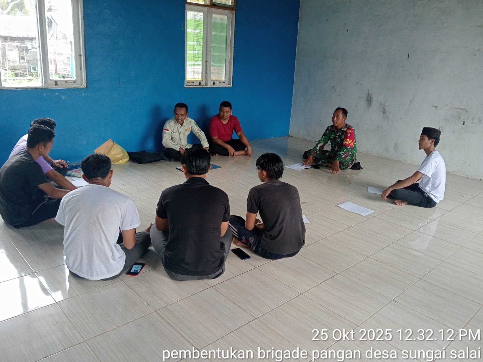 TAPIN — Babinsa Koramil 1010-05/Candi Laras Utara (CLU), Sertu Eky Prasetiyo, menghadiri acara pembentukan dan pengukuhan Brigade Pangan “Maju Bersama” yang dilaksanakan di Desa Sungai Salai, Sabtu (25/10).
