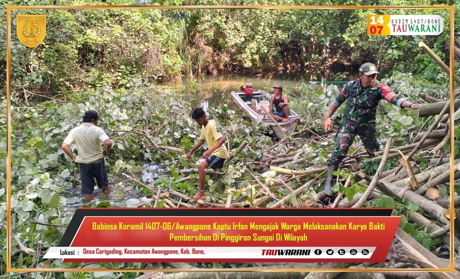 Bone – Babinsa Koramil 1407-06/Awangpone, Koptu Irfan, mengajak warga Desa Carigading, Kecamatan Awangpone, Kabupaten Bone, untuk melaksanakan karya bakti pembersihan di pinggiran sungai pada Senin (10/02/2025).