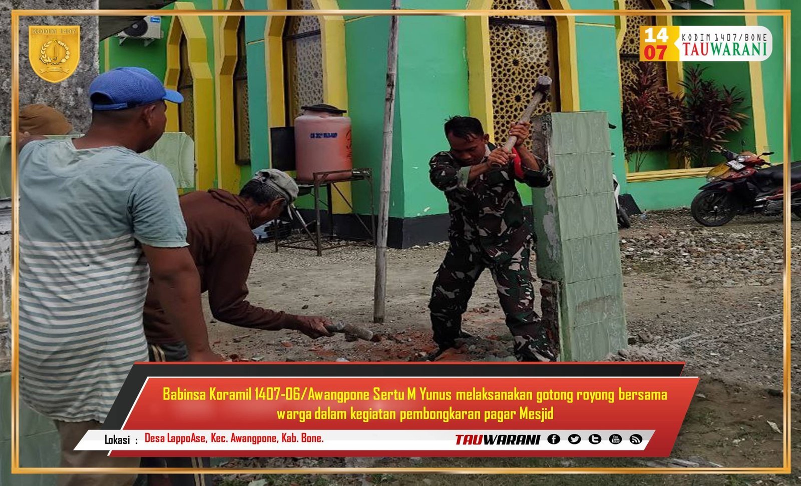 Bone – Sebagai wujud kepedulian terhadap fasilitas ibadah dan kebersamaan dengan masyarakat, Babinsa Koramil 1407-06/Awangpone, Sertu M Yunus, bersama warga melaksanakan gotong royong dalam kegiatan pembongkaran pagar Masjid di Dusun Bilae, Desa Lappoase, Kecamatan Awangpone, Kabupaten Bone.