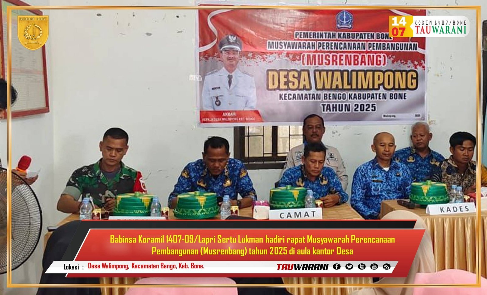 Bone – Babinsa Koramil 1407-09/Lapri, Sertu Lukman, menghadiri rapat Musyawarah Perencanaan Pembangunan (Musrenbang) tahun 2025 yang dilaksanakan di aula kantor Desa Walimpong, Kecamatan Bengo, Kabupaten Bone, Senin (20/01/2025).