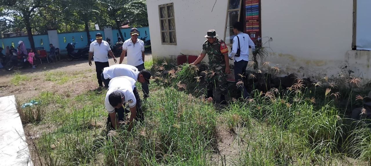 Serka Sakri bersama aparat desa dan warga tersebut dengan semangat sambil bercanda ria membersihkan halaman kantor Desa.