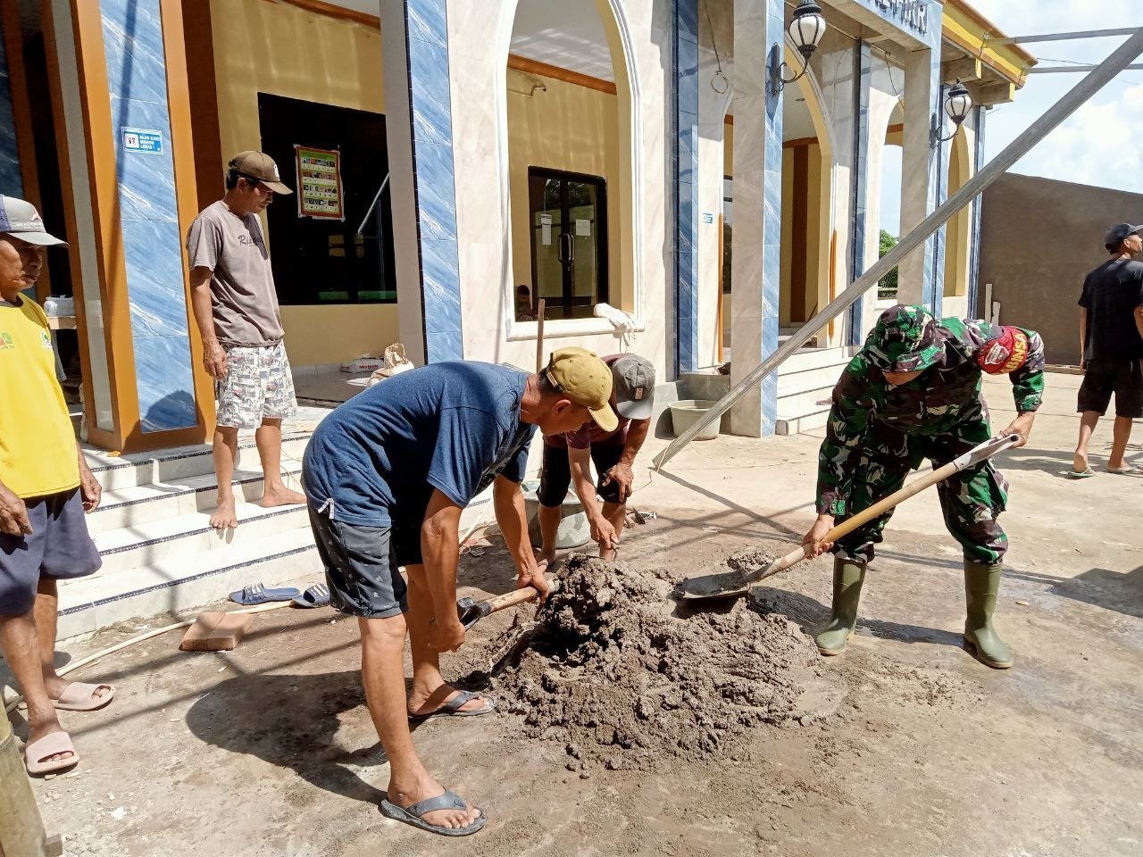 Dalam kegiatan tersebut, Serka Saharuddin bersama warga sedang melakukan pekerjaan pada bagian pembuatan campuran semen dan pasir yang diperlukan tukang untuk membangun masjid.