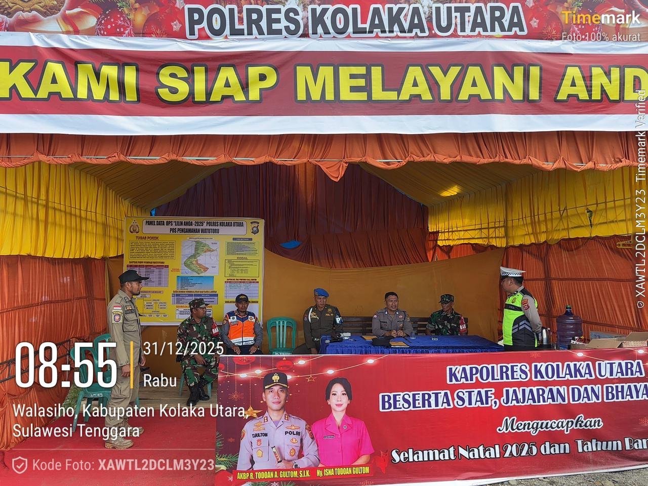 Kolaka Utara – Rabu (31/12/2025) Babinsa Koramil 1412-08/Ranteangin Kodim 1412/Kolaka melaksanakan kegiatan pengamanan Pos Pengamanan (Pos Pam) Natal dan Tahun Baru bersama instansi terkait. Kegiatan pengamanan tersebut dilaksanakan di Desa Walasiho, Kecamatan Wawo, Kabupaten Kolaka Utara.