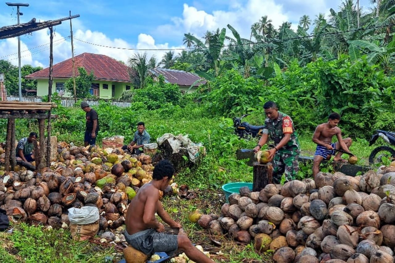 Kegiatan ini dilakukan sebagai bentuk dukungan Babinsa terhadap perekonomian masyarakat yang mayoritas bekerja sebagai petani kelapa. Dengan turun langsung ke lapangan, Sertu Rahmat Pariusamahu membantu proses pembelahan kelapa sebelum dijemur untuk dijadikan kopra, yang nantinya akan dijual ke pengepul sebagai bahan baku industri minyak kelapa.