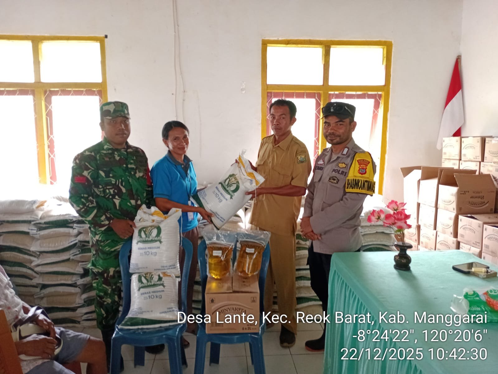 Manggarai — Babinsa Koramil 1612-02/Reok, Praka Firmansyah, menghadiri sekaligus melakukan pendampingan kegiatan pembagian bantuan cadangan pangan berupa beras dan minyak goreng kepada masyarakat Desa Lante, Kecamatan Reok Barat, Kabupaten Manggarai, Senin (22/12/2025).