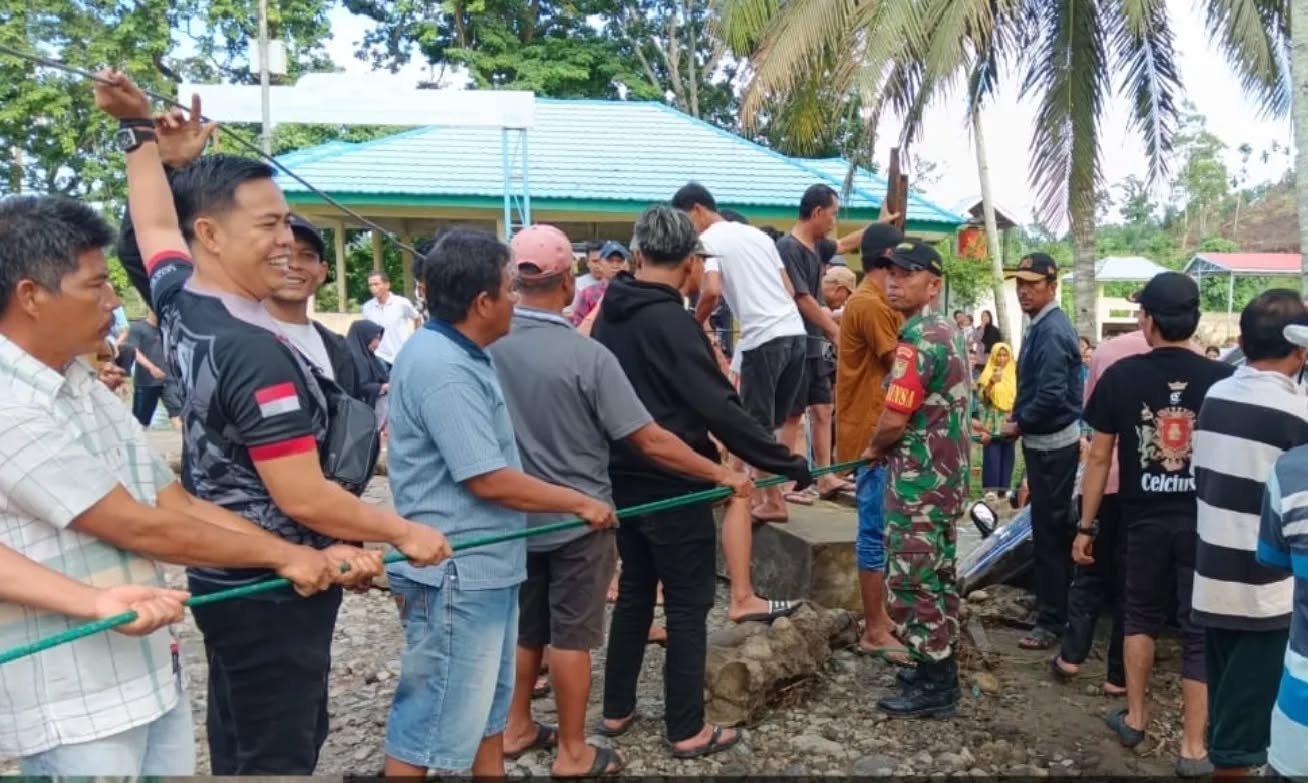 Kaur- Babinsa Koramil 408-02/KU Sertu Ocvian Jumadi dan Sertu Sulaiman irawan Mendatangai wilayah yang terhimbas oleh banjir akibat hujan deras yang turun di Desa Air Kering ll, Kecamatan Padang Guci Hilir, Kabupaten Kaur,Senin (7/4/25)