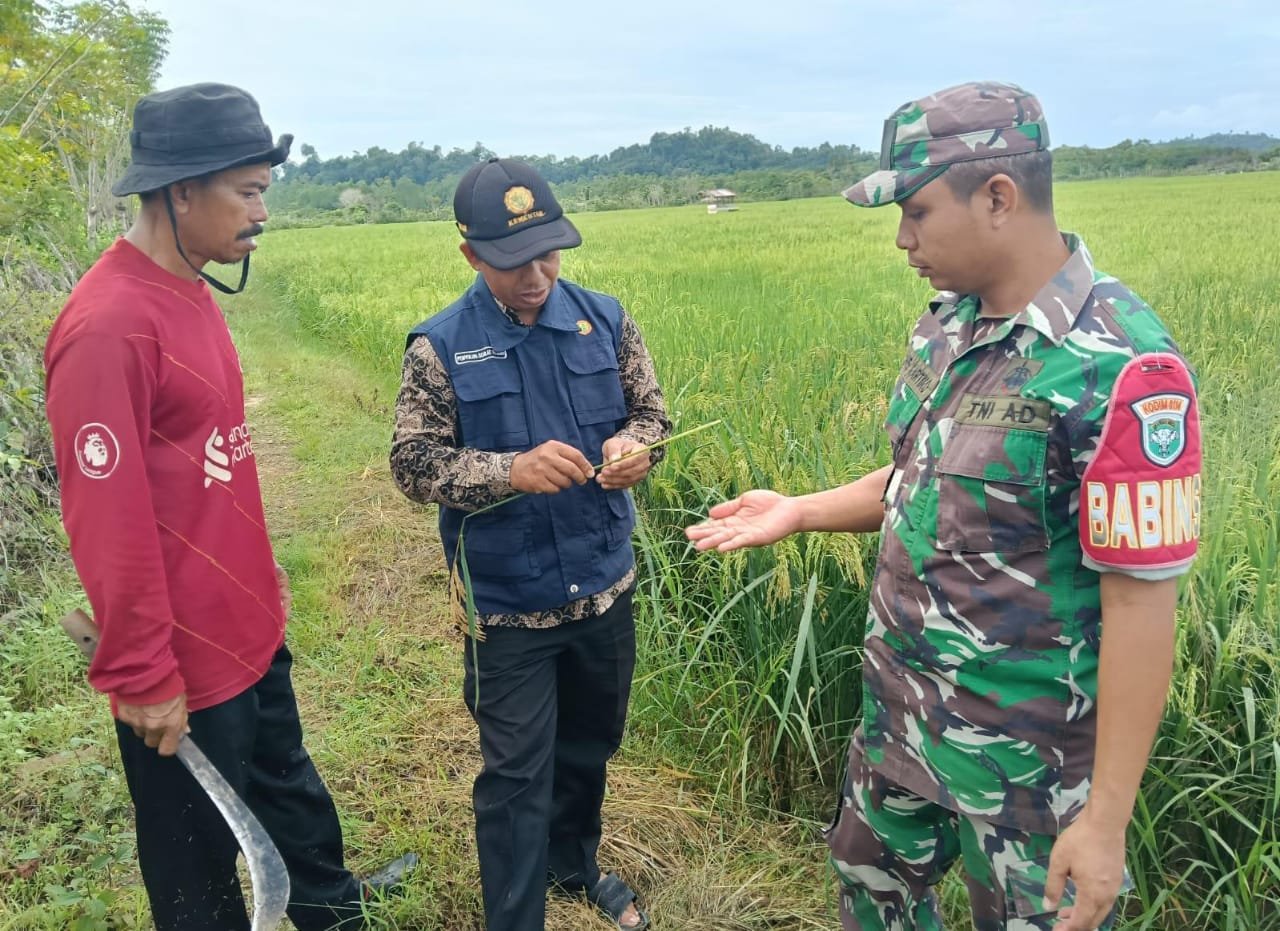 Pengecekan tersebut dilakukan untuk memastikan pertumbuhan padi berjalan dengan baik serta mendeteksi secara dini kemungkinan adanya hama yang dapat merusak tanaman. Dalam kegiatan itu, Babinsa bersama PPL dan petani turun langsung ke sawah untuk mengamati kondisi daun, batang, dan area persawahan.
