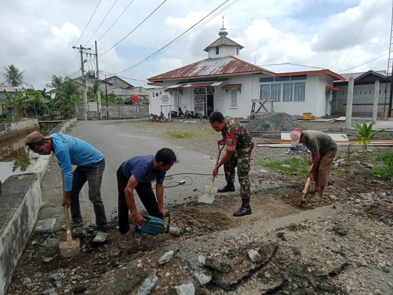 ACEH BARAT – Sertu Ahmad Khaerudin, Babinsa Koramil 07/Johan Pahlawan Kodim 0105/Aceh Barat, melaksanakan kegiatan gotong royong bersama warga dalam pembuatan pengecoran jalan di Desa Drien Rampak, Kecamatan Johan Pahlawan, Kabupaten Aceh Barat, Kamis (16/10/2025).