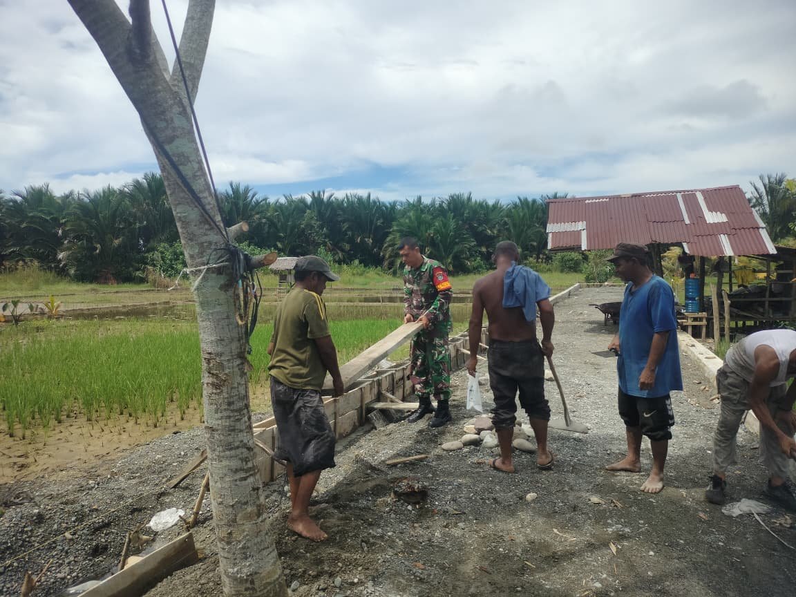 ACEH BARAT – Babinsa Koramil 07/Johan Pahlawan Kodim 0105/Aceh Barat, Sertu Agustino, membantu warga binaan di Desa Kampung Darat dalam pembangunan talud jalan guna meningkatkan aksesibilitas dan kelancaran aktivitas masyarakat, Rabu (1/10/2025).