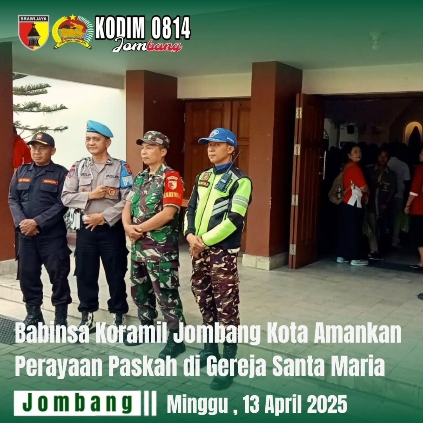 Jombang – Dalam rangka mendukung kelancaran dan keamanan perayaan Paskah, Babinsa Koramil 0814/01Jombang Kota melaksanakan pengamanan ibadah di Gereja Katolik Santa Maria Jombang, Minggu pagi (13/04/2025).