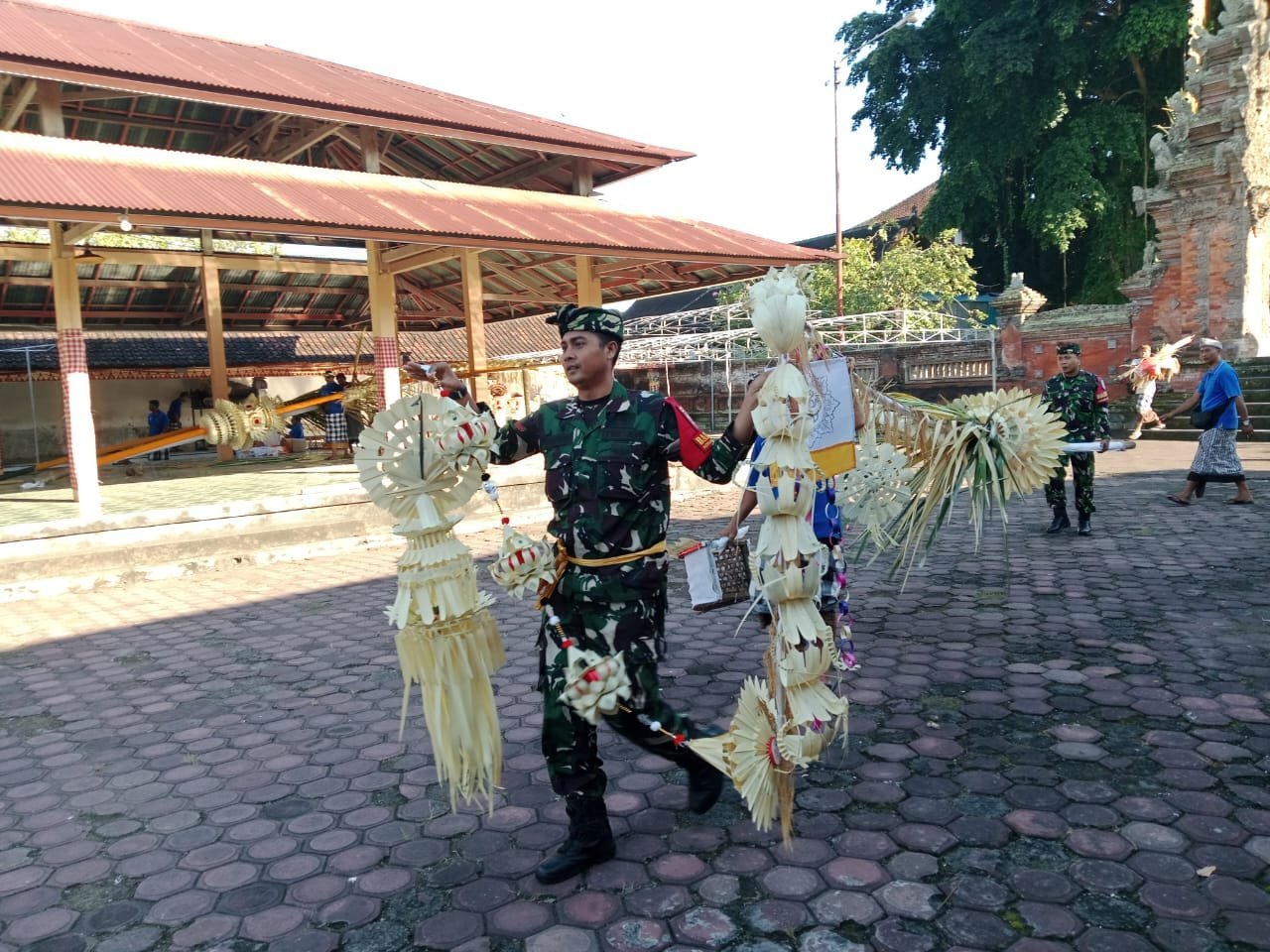 Babinsa Koramil Klungkung Gotong Royong Songsong Karya pemacekan Agung Di Pura Dasar Bhuana Gelgel