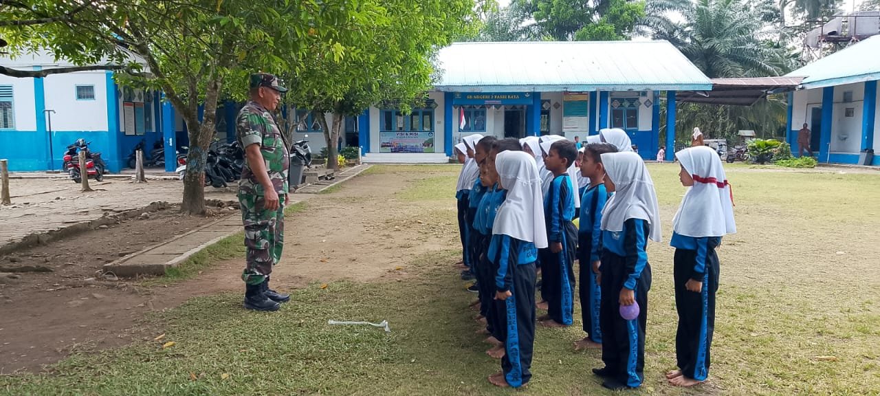 ACEH JAYA – Babinsa Posramil Pasie Raya Kodim 0114/Aceh Jaya, Sertu T. Herman, melaksanakan kegiatan pembinaan wawasan kebangsaan kepada siswa Sekolah Dasar Negeri 2 Pasie Raya melalui latihan Peraturan Baris Berbaris (PBB), Selasa (03/02/2026).