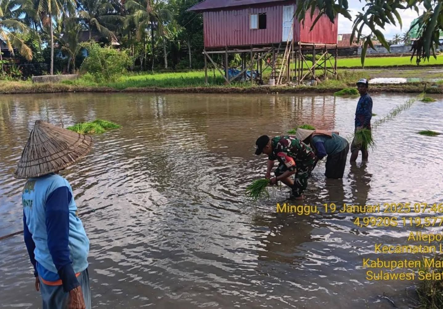Babinsa Maros Dukung Ketahanan Pangan dengan Membantu Petani Tanam Padi
