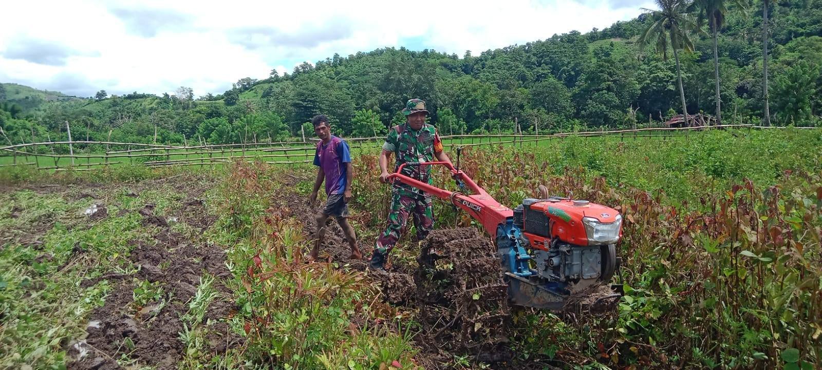 Babinsa Sertu Ejiman mengatakan, guna mendukung program ketahanan pangan nasional, dirinya membantu warga membajak sawah di Desa Praingkareha menggunakan traktor untuk musim tanam 2025