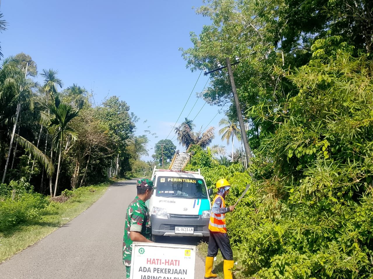 Koptu Tatang S bersama petugas PLN dan warga setempat bekerja sama memotong dan menyingkirkan pohon yang berpotensi menghambat jaringan listrik. Kegiatan ini juga sebagai bentuk kepedulian Babinsa dalam menjaga keamanan dan kenyamanan masyarakat.