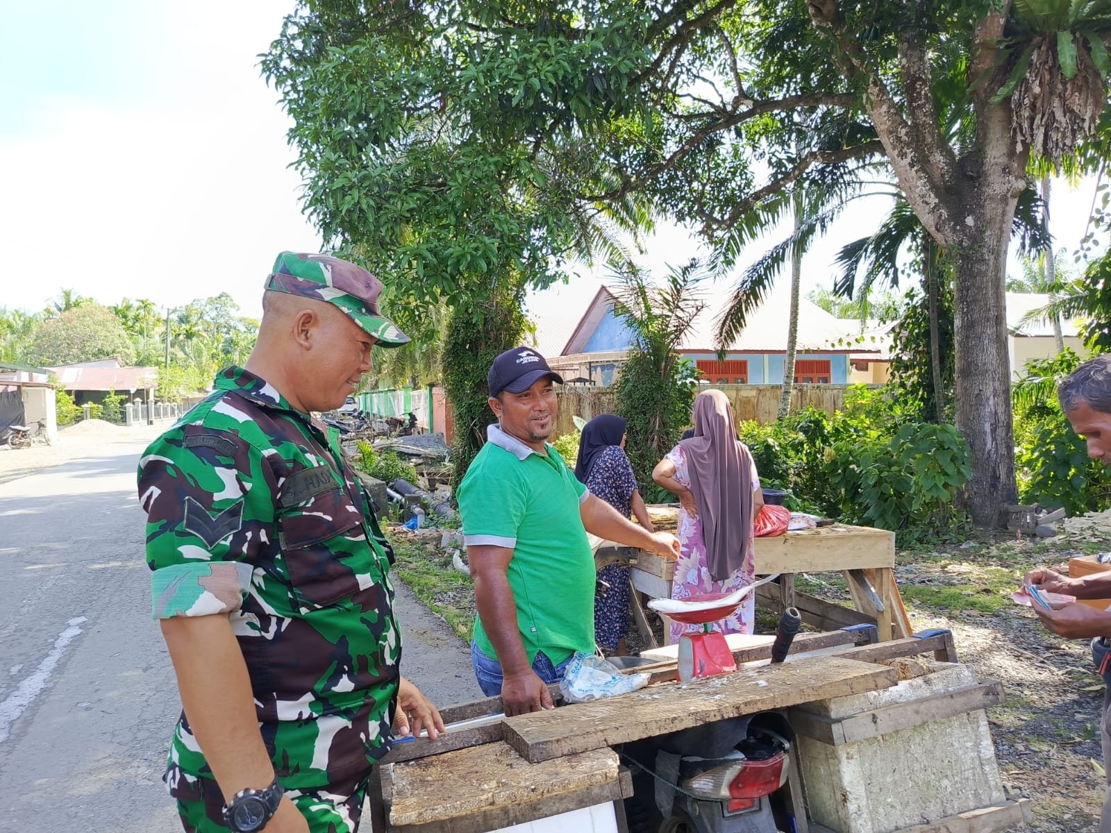 ACEH JAYA – Babinsa Posramil Pasie Raya Kodim 0114/Aceh Jaya, Sertu Syamsul, melaksanakan komunikasi sosial (komsos) bersama pedagang ikan keliling di Desa Pasi Teubee, Kecamatan Pasie Raya, Minggu (01/03/2026).