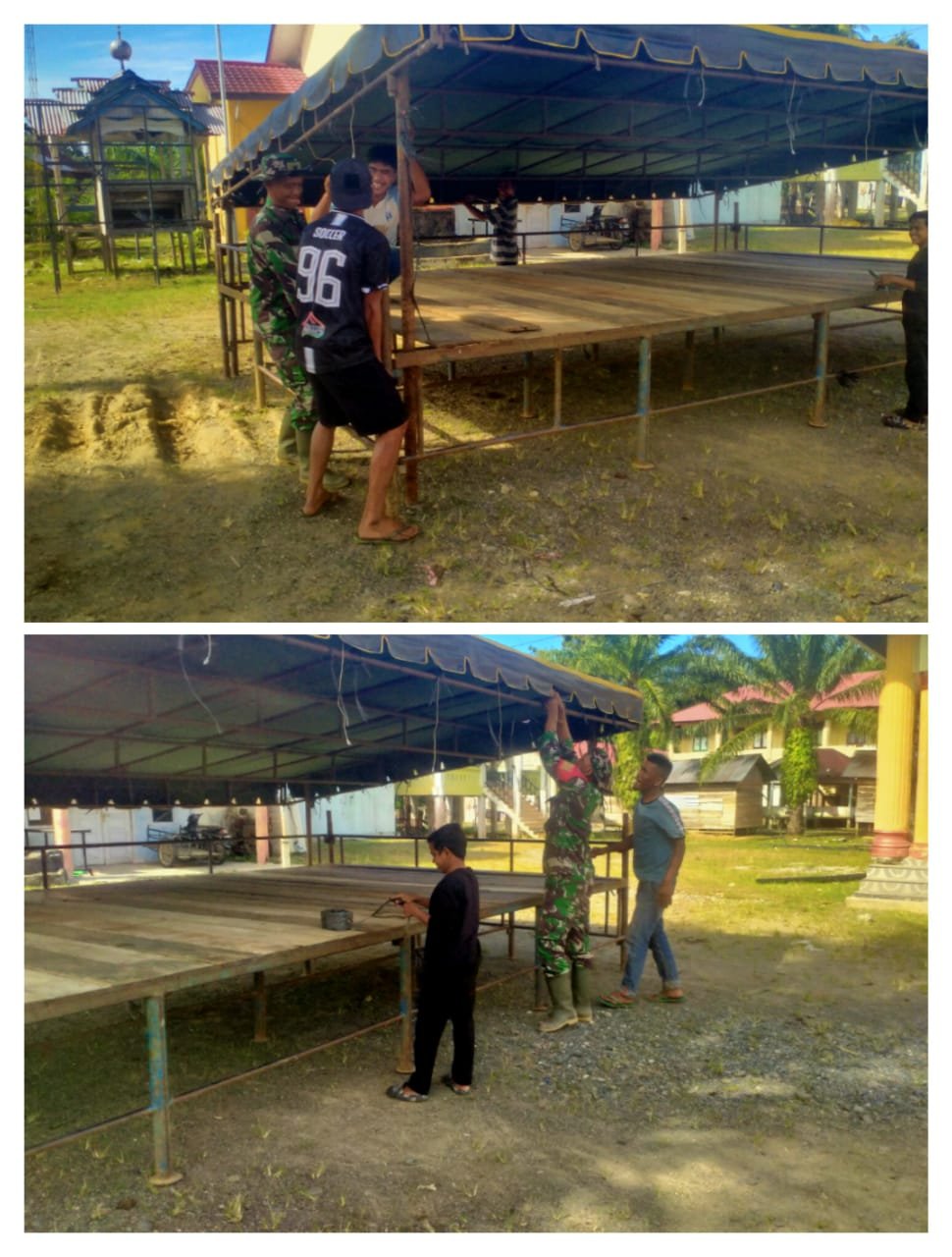 Dalam pelaksanaannya, Sertu Ruswandi bersama warga setempat bergotong royong mendirikan tenda yang akan digunakan untuk keperluan kegiatan masyarakat. Kehadiran Babinsa di tengah-tengah warga tidak hanya membantu secara tenaga, tetapi juga memberikan motivasi agar semangat kebersamaan dan gotong royong tetap terjaga.