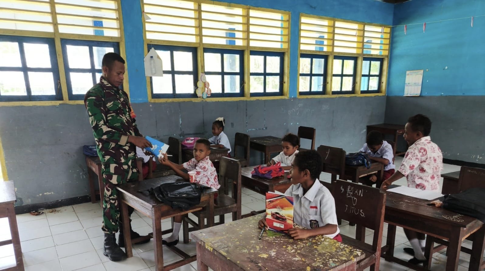 Napan ~ Babinsa ramil 1705-02/Napan Serka Esaul M membantu para guru untuk memberikan materi terhadap siswa-siswi Baru SDN Inpres Kampung Waenami Distrik Napan Kab. Nabire.