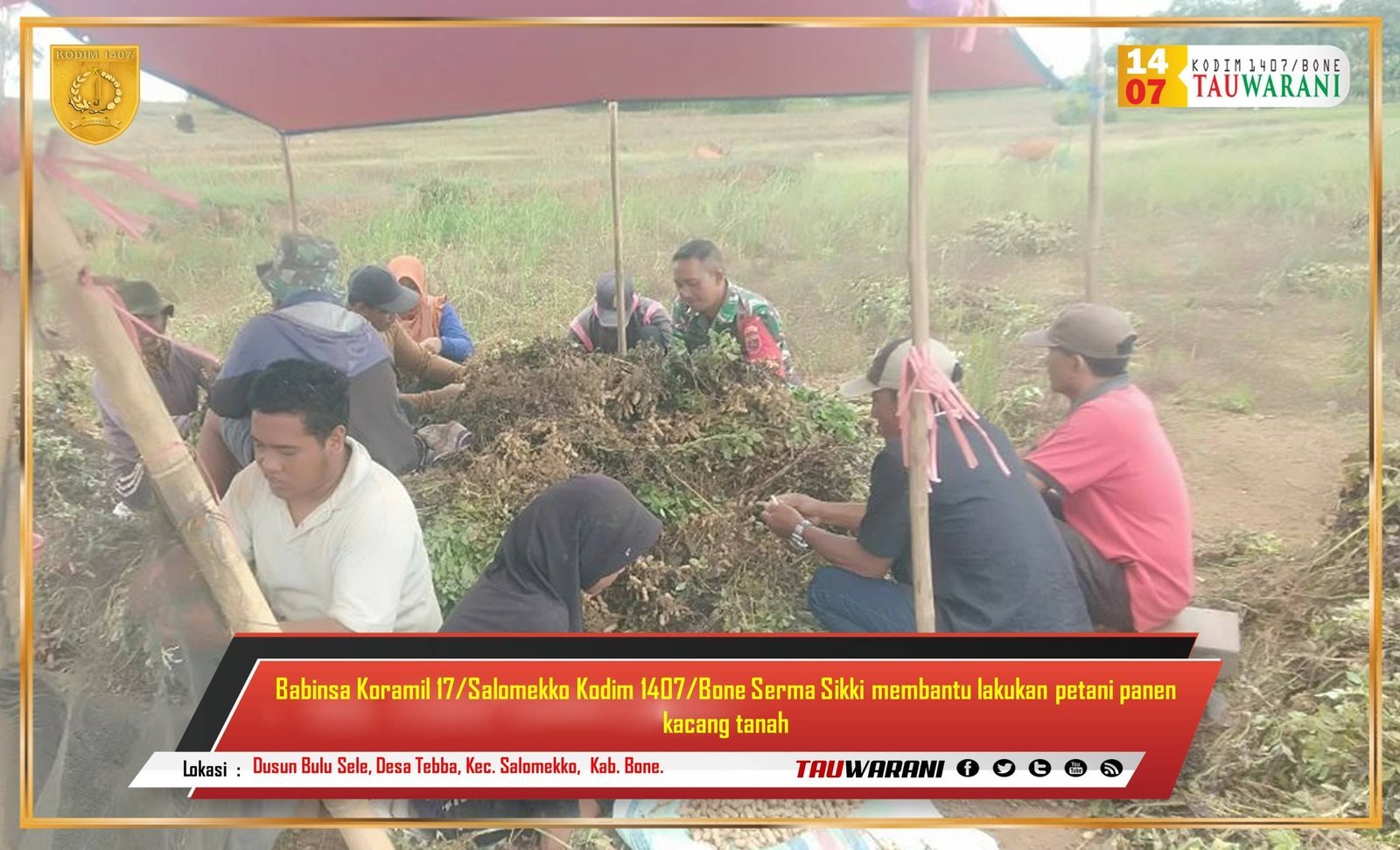 BONE – Serma Sikki, Babinsa Koramil 17/Salomekko Kodim 1407/Bone, turut serta membantu petani dalam kegiatan panen kacang tanah di Dusun Bulu Sele, Desa Tebba, Kecamatan Salomekko, Kabupaten Bone, pada Rabu (12/02/2025).