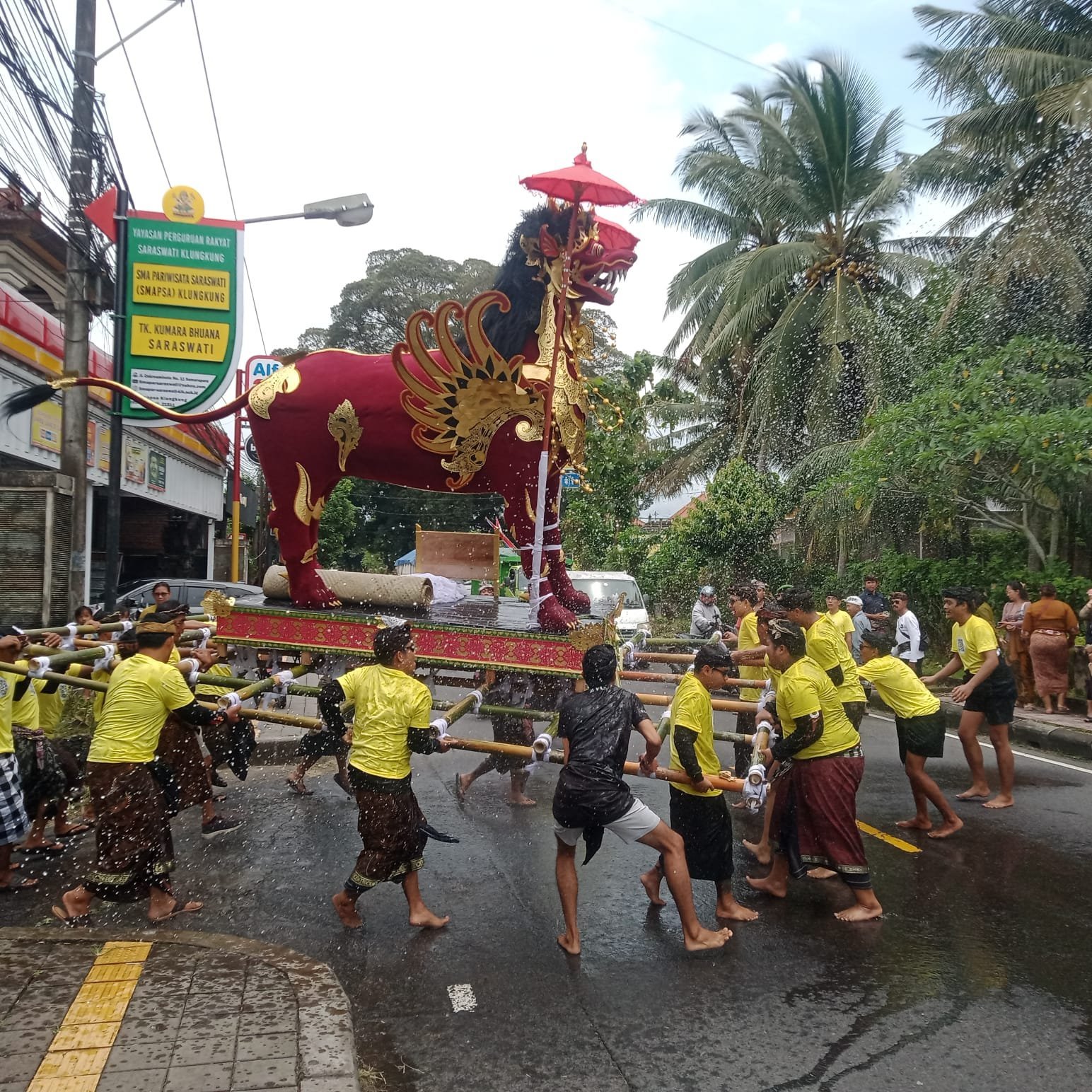 Pelaksanaan kegiatan yang diwarnai dengan arak-arakan jenasah menuju setra ( kuburan ) tersebutpun dikawal langsung oleh Babinsa dan Bhabinkamtibmas Semarapura Tengah yang dibantu para pecalang.