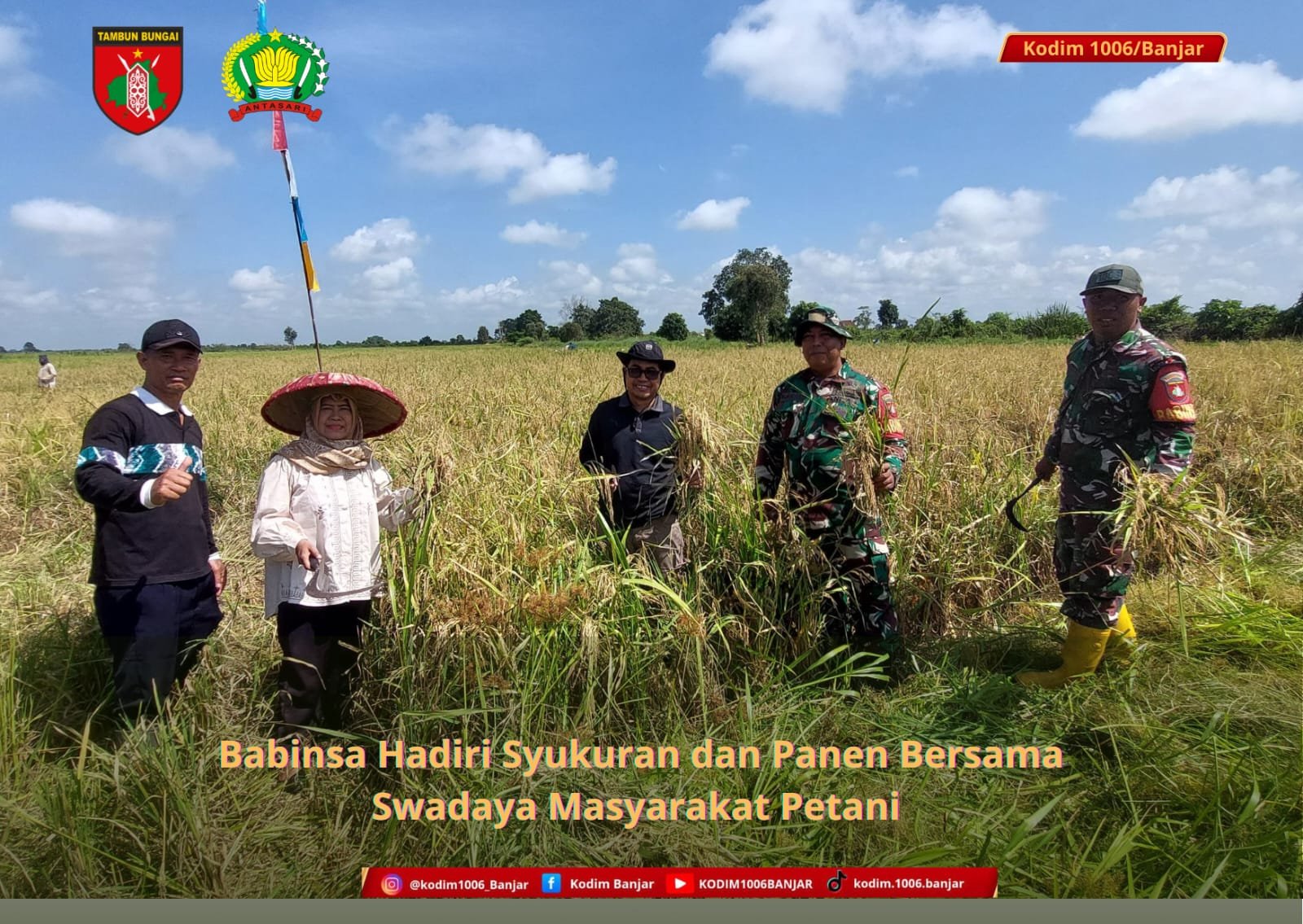 Martapura – Babinsa Desa Sungai Batang, Koramil 1006-06/Martapura, Serda Dina turut hadir dalam kegiatan Syukuran dan Panen Bersama Swadaya Masyarakat Petani Tahun Anggaran 2025 yang berlangsung di Saung Paman Birin, Sabtu (18/10/2025).