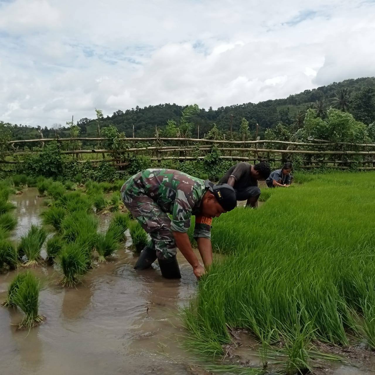 Babinsa Koramil 04/Tabundung. Kodim 1601/Sumba Timur., Serda M.Jaini melaksanakan pendampingan hanpangan membantu masyarakat mencabut bibit padi yang akan di tanam dengan luas lahan -+80 are. di Desa Praingkareha Kec. Tabundung, Kabupaten Sumba Timur.Kamis (13-02-2025).