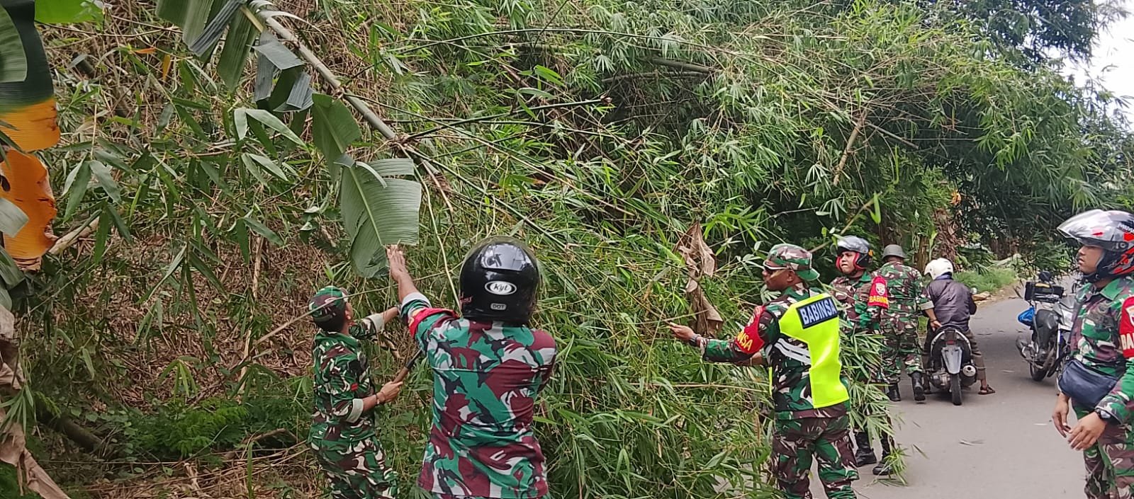 Dengan sigap, Babinsa melakukan evakuasi dan pembersihan pohon tumbang agar arus lalu lintas kembali normal serta mencegah terjadinya kecelakaan bagi masyarakat pengguna jalan.