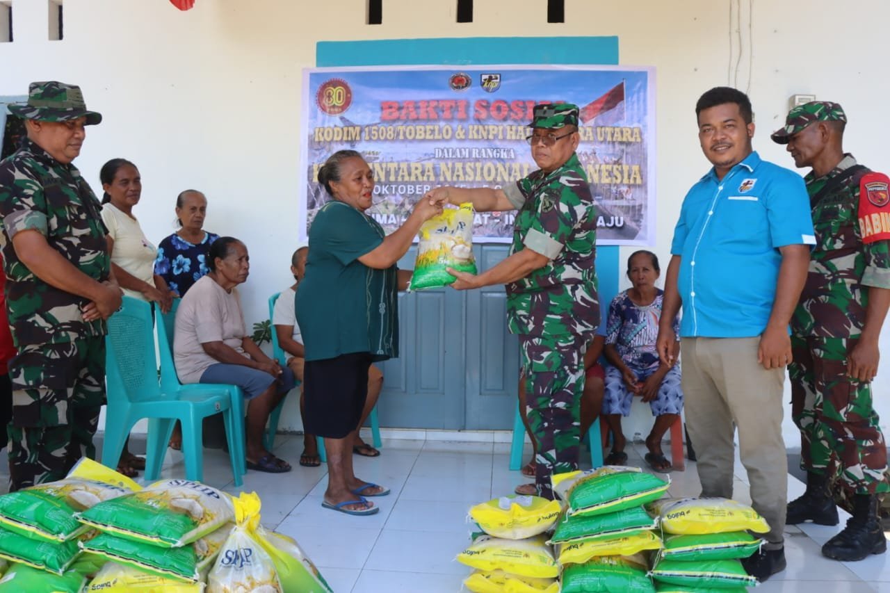 Halmahera Utara, – Dalam rangka memperingati Hari Ulang Tahun (HUT) ke-80 Tentara Nasional Indonesia (TNI), Komando Distrik Militer (Kodim) 1508/Tobelo bersama Komite Nasional Pemuda Indonesia (KNPI) Kabupaten Halmahera Utara melaksanakan kegiatan bakti sosial berupa pembagian bahan pangan kepada masyarakat pesisir.