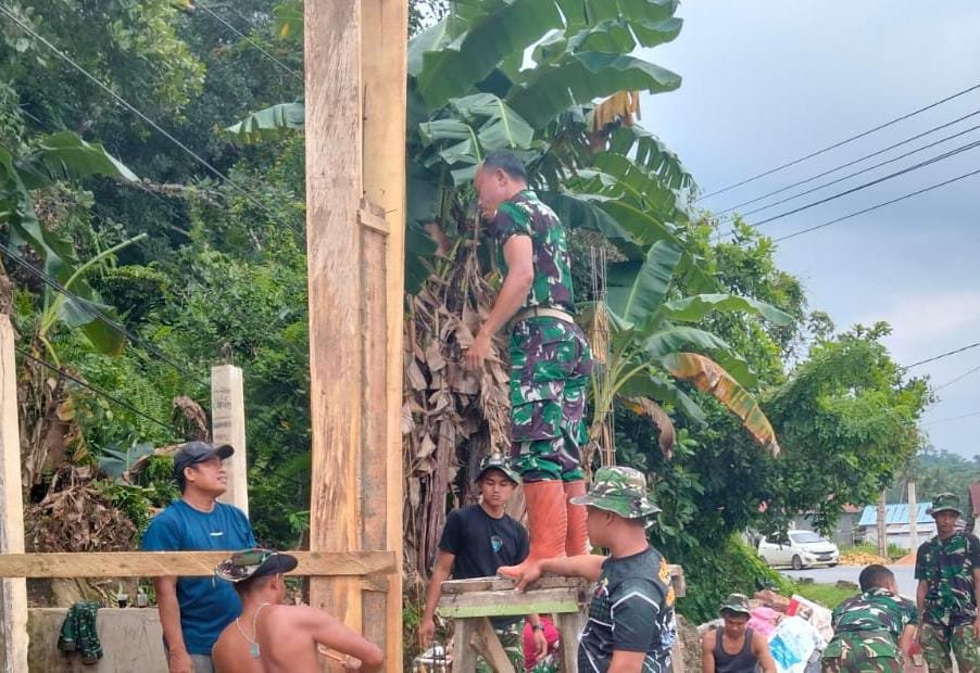 Personel Satgas bersama masyarakat terlihat bekerja kompak memasang tiang mal sebagai bagian dari tahapan awal pembangunan fasilitas MCK. Proses tersebut dilakukan dengan penuh kehati-hatian agar konstruksi dapat berdiri stabil dan aman digunakan masyarakat.