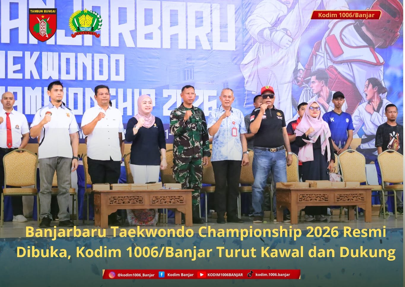 Banjarbaru – Komando Distrik Militer (Kodim) 1006/Banjar menunjukkan komitmennya dalam mendukung pembinaan generasi muda melalui partisipasi pada pembukaan Event Banjarbaru Taekwondo Championship 2026 yang digelar di GOR Rudy Resnawan, Kota Banjarbaru, Sabtu (11/4/2026).