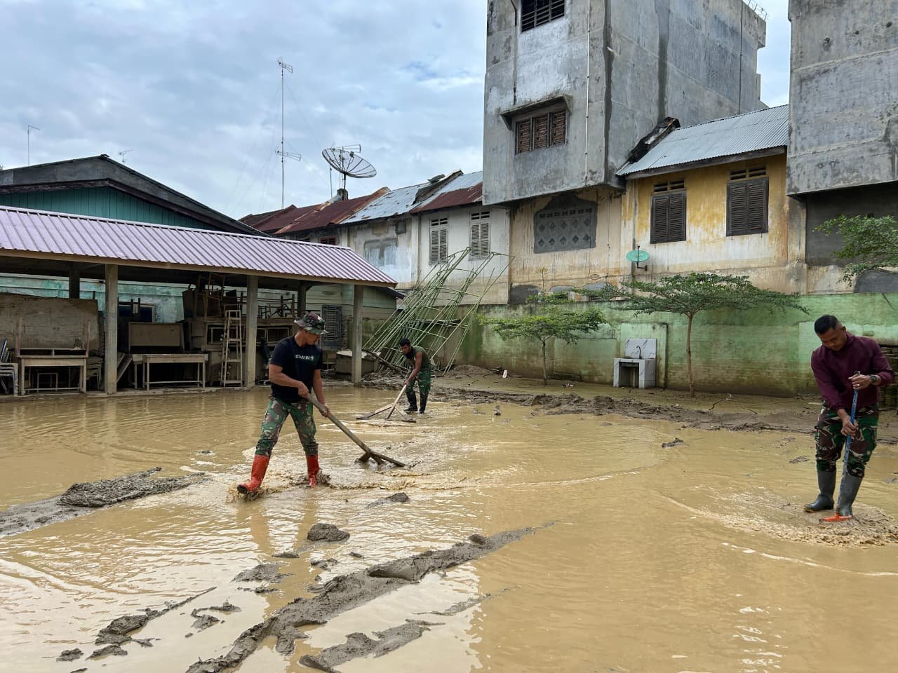 Personel TNI bersama masyarakat setempat bergotong royong membersihkan material lumpur, sampah, dan puing-puing yang mengganggu proses belajar mengajar serta pelayanan publik. Sejumlah sekolah, rumah ibadah, dan fasilitas umum lainnya menjadi sasaran utama kegiatan karya bakti tersebut.