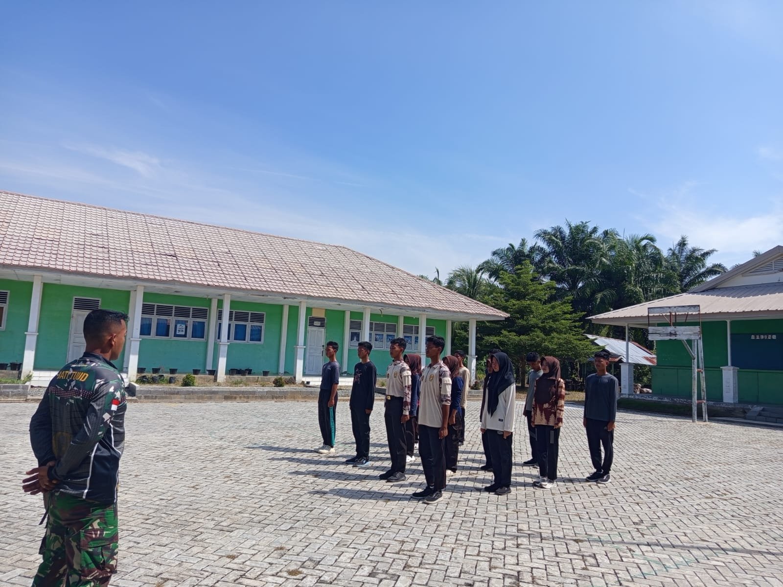 ACEH JAYA — Batuud Koramil 06/Teunom Kodim 0114/Aceh Jaya, Sertu Arief W.P., melaksanakan kegiatan pelatihan Peraturan Baris Berbaris (PBB) variasi kepada siswa-siswi Pramuka Saka Wira Kartika binaan Koramil 06/Teunom, Minggu (18/01/2026).