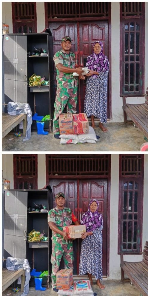 ACEH BARAT – Babinsa Koramil 01/Sungaimas Kodim 0105/Abar, Serda Surya Darma, melaksanakan kegiatan pemberian bantuan kepada salah satu warga, yaitu Ibu Nursibah, yang sebagian rumahnya rusak berat dan amblas ke sungai akibat banjir. Kegiatan ini berlangsung di Desa Lancong, Kecamatan Sungaimas, Jumat (02/01/2026).