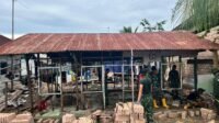 Personel TNI dan warga terlihat berderet mengangkat batako secara bergantian. Kerja sistematis dan penuh semangat itu menjadi kunci percepatan pembangunan empat ruang kelas baru.