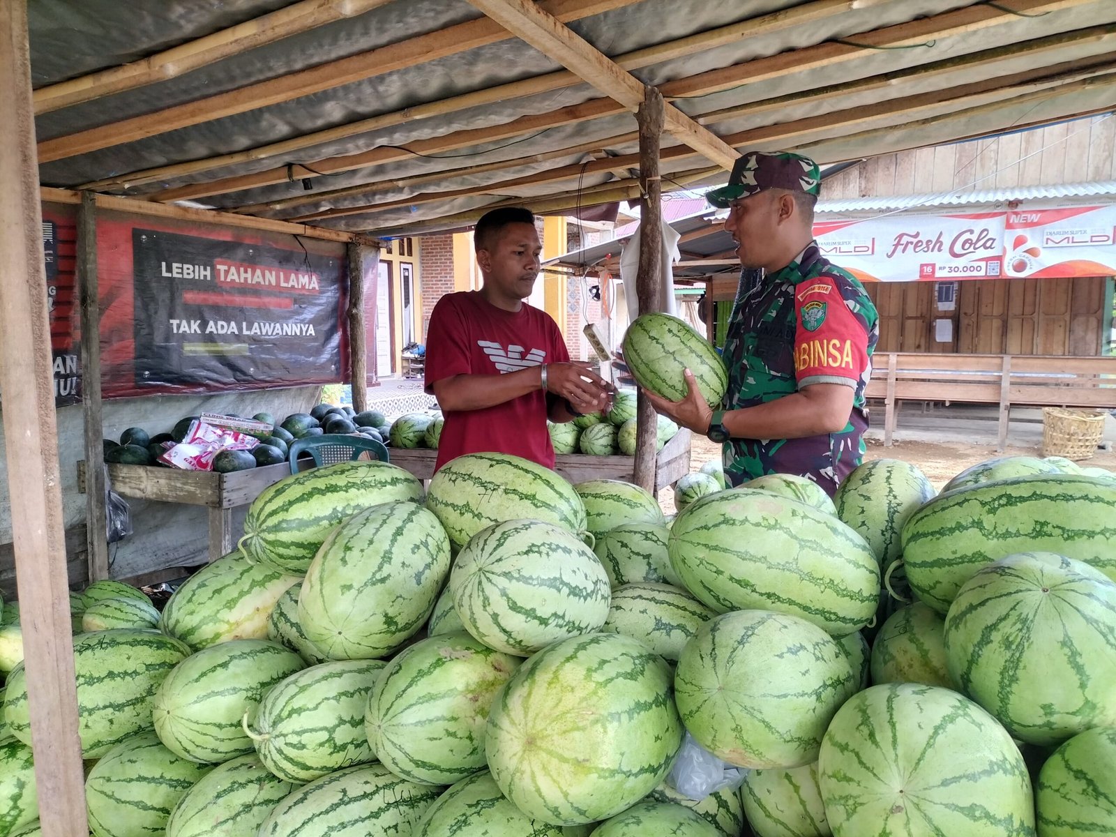 Beri Motivasi saat Ramadhan, Babinsa Komsos dengan Pedagang Semangka di Wilayah Binaan