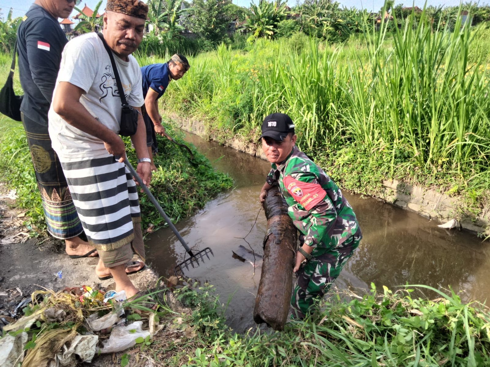 Tampak dalam pantauan, dengan berpakaian dinas Peltu Made Rai tak ragu turun langsung membersihkan sampah-sampah yang menghambat aliran sungai lobong.