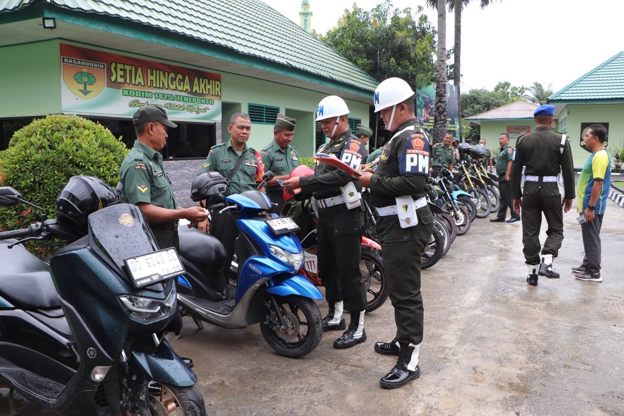 JENEPONTO – Komando Distrik Militer (Kodim) 1425 Jeneponto bekerjasama dengan Dan Sub Denpom XIV/1-2 Bantaeng melaksanakan pemeriksaan kendaraan roda 2 dan roda 4 yang melibatkan kendaraan dinas maupun pribadi prajurit dan PNS, bertempat di Halaman Kantor Makodim Jl. Lanto Dg Pasewang Kelurahan Balang, Kecamatan Binamu, Kabupaten Jeneponto Kamis, (30/1/25).