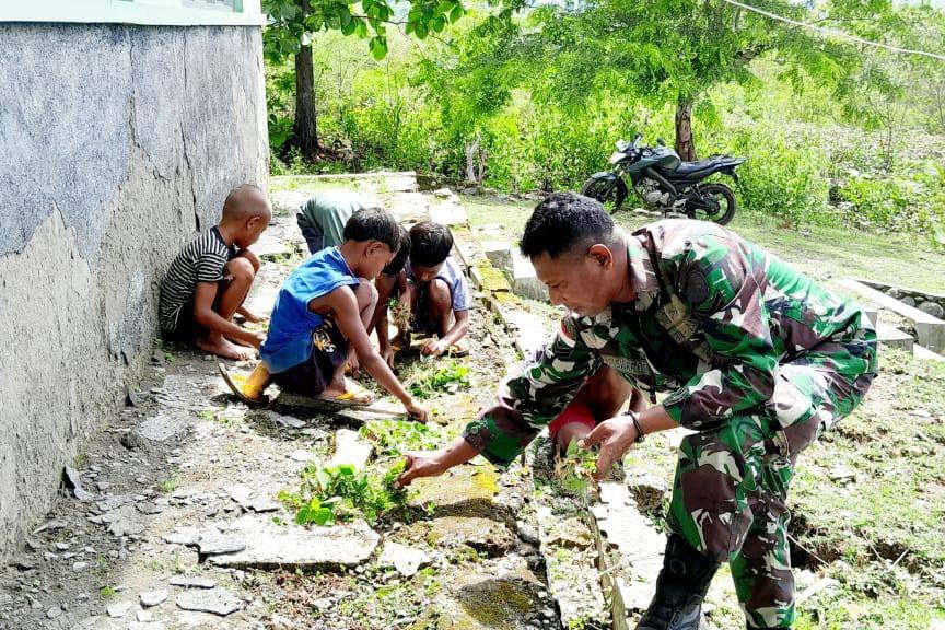 SATGASTER KODIM 1605/BELU, Serka Rui Vicente dan Sertu Zefrino Baros personil Satgaster Kodim 1605/Belu Pos Halibete 2 bersama dengan anak-anak SDN Motaain melaksanakan pembersihan di sekeliling pekarangan Pos Halibete 2 agar tetap terpelihara kebersihan Pos, Minggu (9/2/2025).