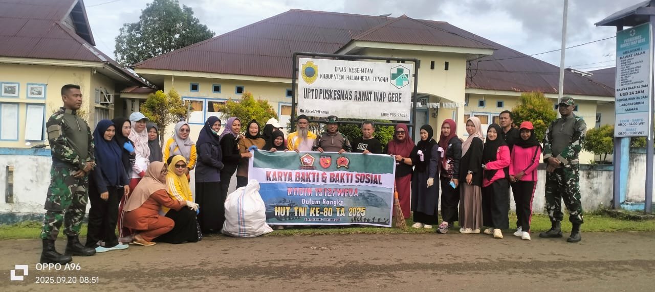 Halmahera Tengah-Personel Koramil 1512-03/Gebe 3 orang Dibawah Pimpinan Danramil Letda Inf Salim kapitanhitu melaksanakan Karya Bakti pembersihan Puskesmas Pulau Gebe dalam rangka menyambut HUT TNI bersama pihak Puskesmas Pulau Gebe dan masyarakat Pulau Gebe bertempat di Puskesmas Pulau Gebe Desa Elfanun Kecamatan Pulau Gebe Kabupaten Halmahera Tengah. Jumat, (26/09/2025)