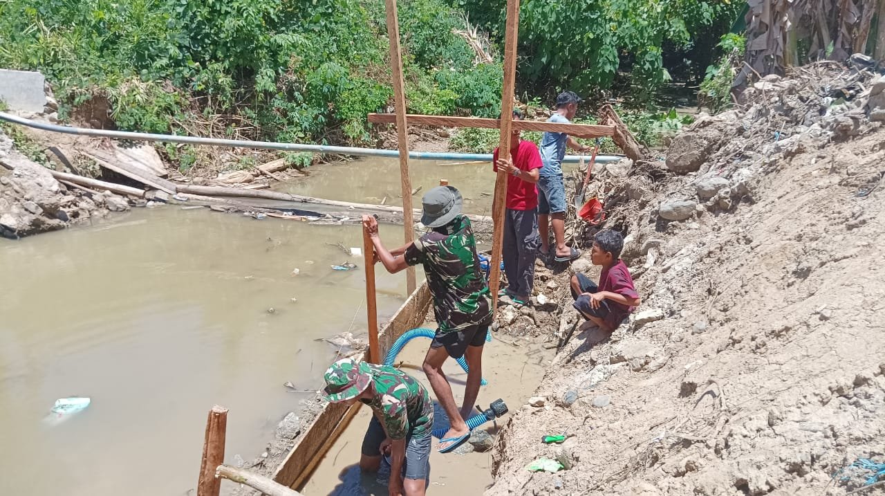 Pemandangan di lokasi pembangunan menunjukkan perjuangan fisik yang cukup berat. Para personel harus bekerja di dalam genangan air untuk mengeluarkan luapan air sungai dari struktur kerangka jembatan beton. Langkah ini dilakukan agar proses pengecoran material campuran semen, besi, dan pasir dapat berjalan dengan baik serta menghasilkan struktur jembatan yang kuat dan berkualitas.