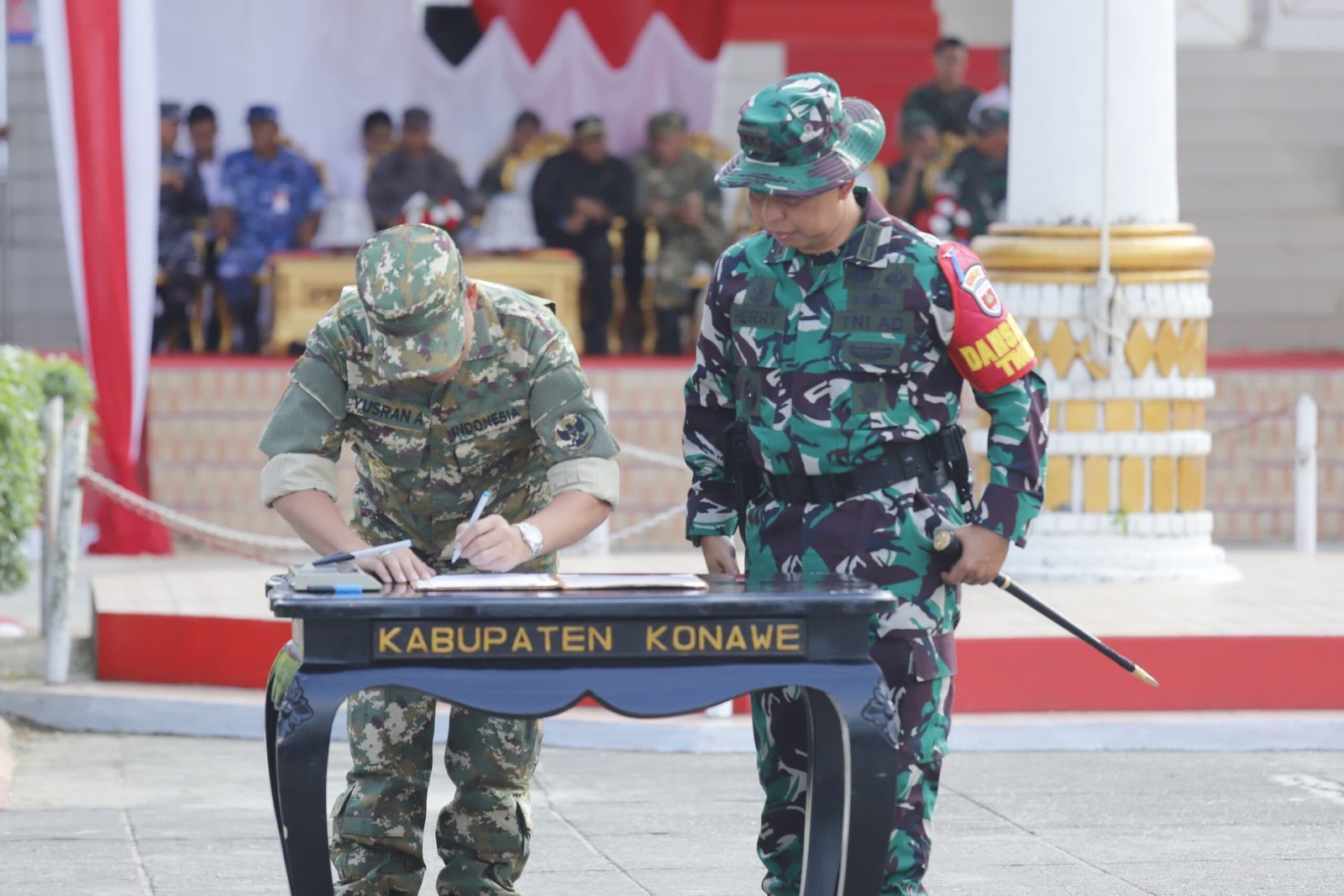 Konawe, 23 Juli 2025 – Pemerintah Kabupaten Konawe bersama Komando Distrik Militer (Kodim) 1417/Kendari secara resmi menandatangani naskah kerja sama pelaksanaan TNI Manunggal Membangun Desa (TMMD) ke-125 Tahun Anggaran 2025, Rabu (23/7). Penandatanganan dilakukan langsung oleh Bupati Konawe, H. Yusran Akbar, ST dan Dandim 1417/Kendari, Kolonel Inf Herry Indrianto, S.I.P di halaman Kantor Bupati Konawe.