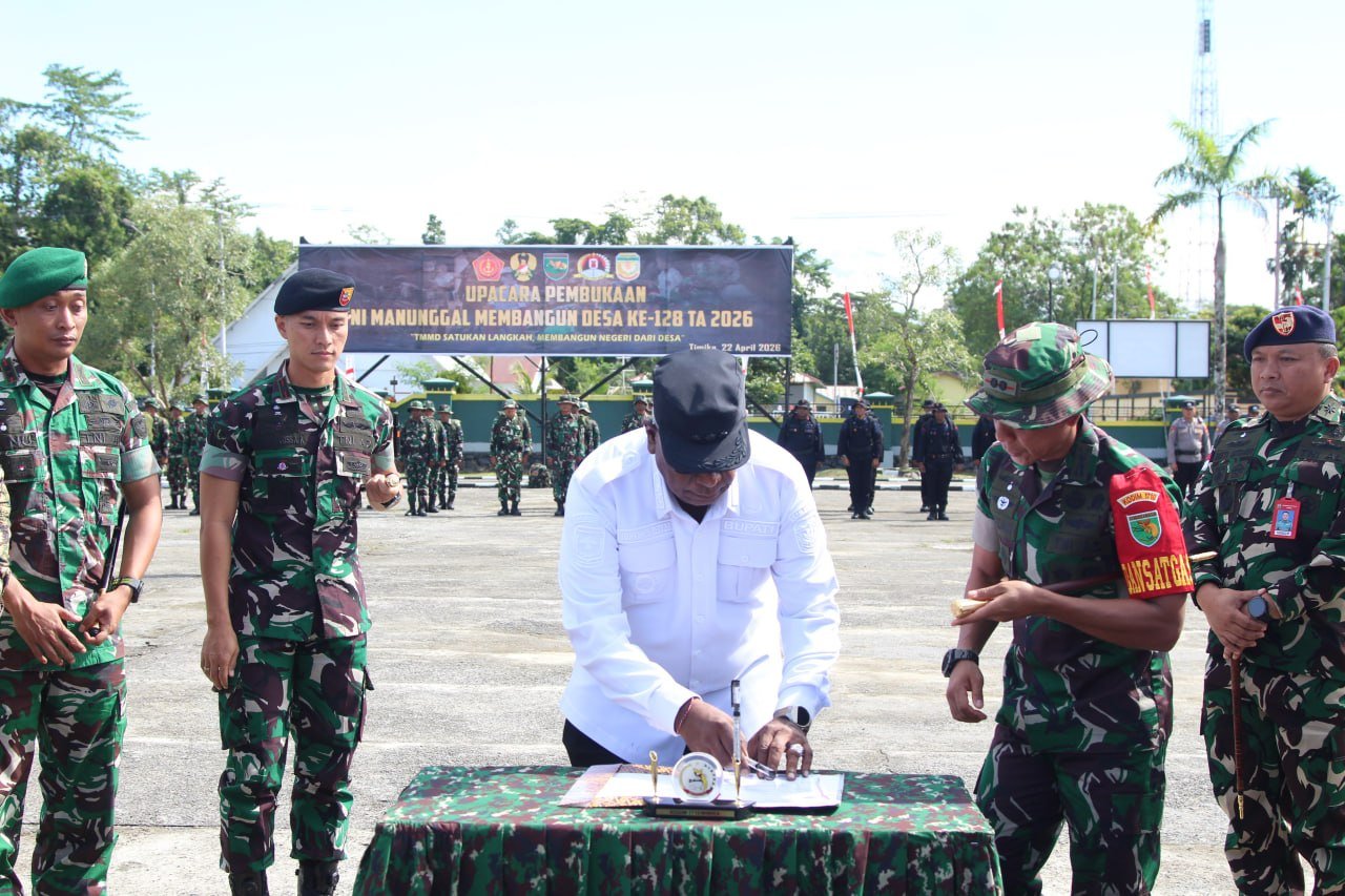 Timika – Penandatanganan naskah TMMD Ke-128 Tahun Anggaran 2026 dilakukan dalam rangkaian upacara pembukaan di Makodim 1710/Mimika, Rabu (22/4/2026).