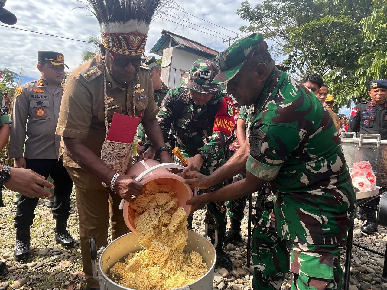 “Saya berharap makanan yang disiapkan di dapur lapangan ini memiliki kualitas yang baik dan dapat dinikmati oleh seluruh masyarakat. Ini bukan sekadar konsumsi biasa, tetapi juga wujud kebersamaan antara warga, TNI, Polri, dan semua pihak yang mendukung terlaksananya TMMD,” ujar Bupati Mimika.