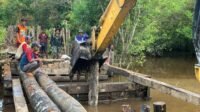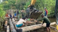 Pemasangan Kayu Penyangga Jembatan di Desa Talio Dibantu Alat Berat