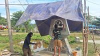 Kreatif, Satgas TMMD 125 di Konawe Gunakan Terpal Antisipasi Hujan Saat Bangun Tugu