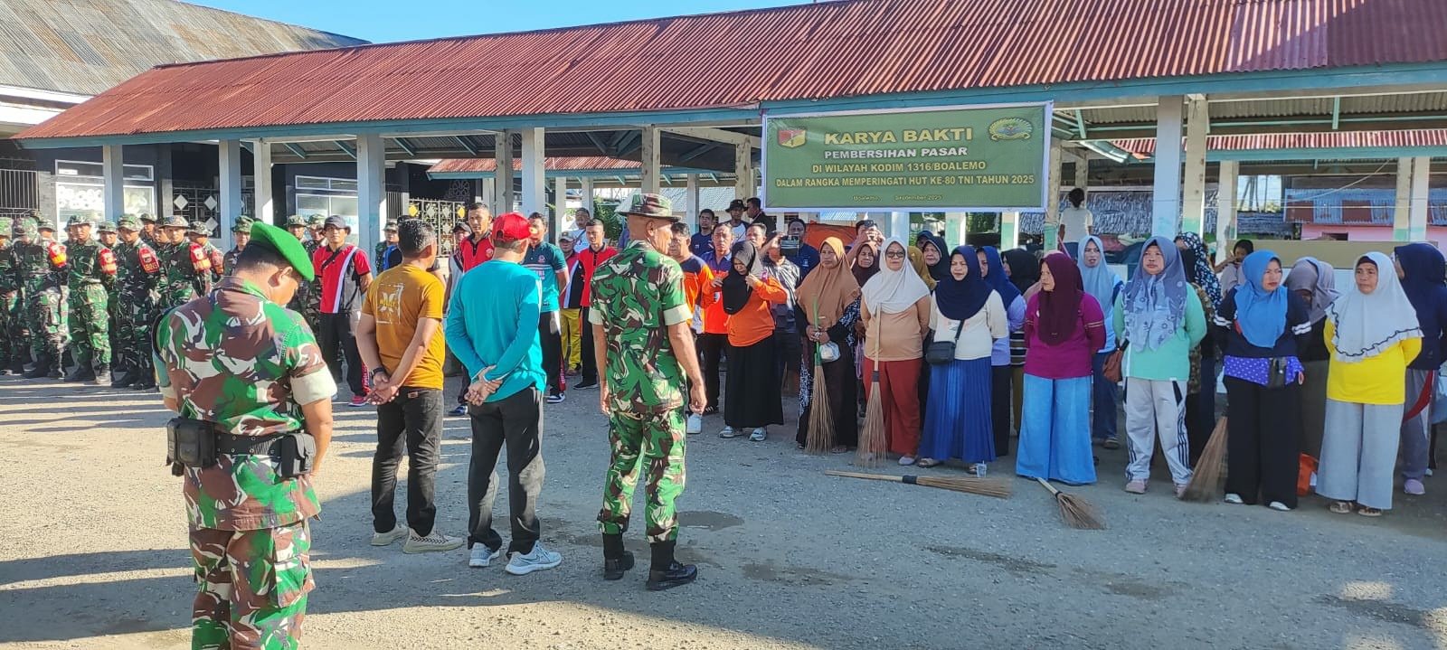 BOALEMO – Dalam semangat menyambut Hari Ulang Tahun (HUT) ke-80 Tentara Nasional Indonesia (TNI), Kodim 1316/Boalemo bersama jajaran Koramil, didukung penuh oleh perangkat desa serta masyarakat setempat, melaksanakan Karya Bakti pembersihan pasar secara masif pada Jumat pagi (03/10/2025).