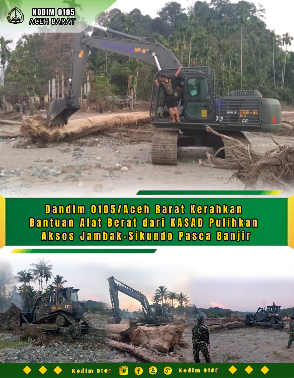 ACEH BARAT – Dandim 0105/Aceh Barat, Letkol Inf S. Kembaren, S.E., M.I.P., CFrA., memerintahkan pengerahan alat berat untuk bekerja tanpa henti guna mempercepat pembukaan kembali jalan penghubung Desa Jambak–Sikundo di Kecamatan Pante Ceureumen, Kabupaten Aceh Barat. Upaya ini dilakukan sebagai langkah darurat pascabencana banjir yang merusak dan memutus akses utama warga, Minggu (18/1/2026).